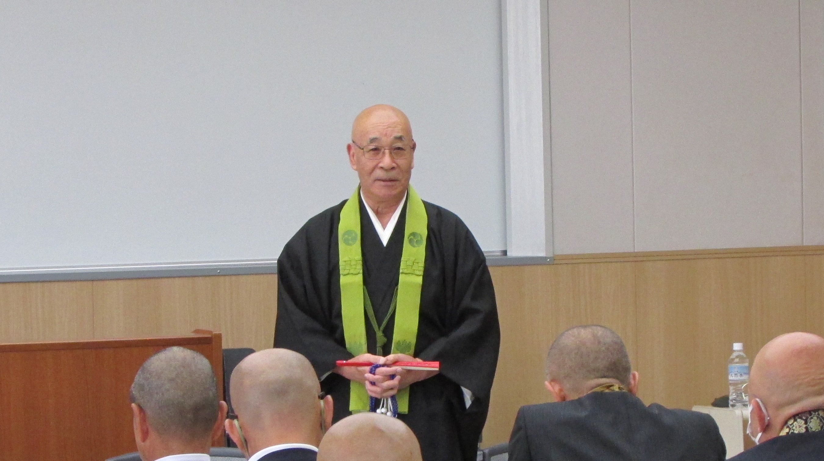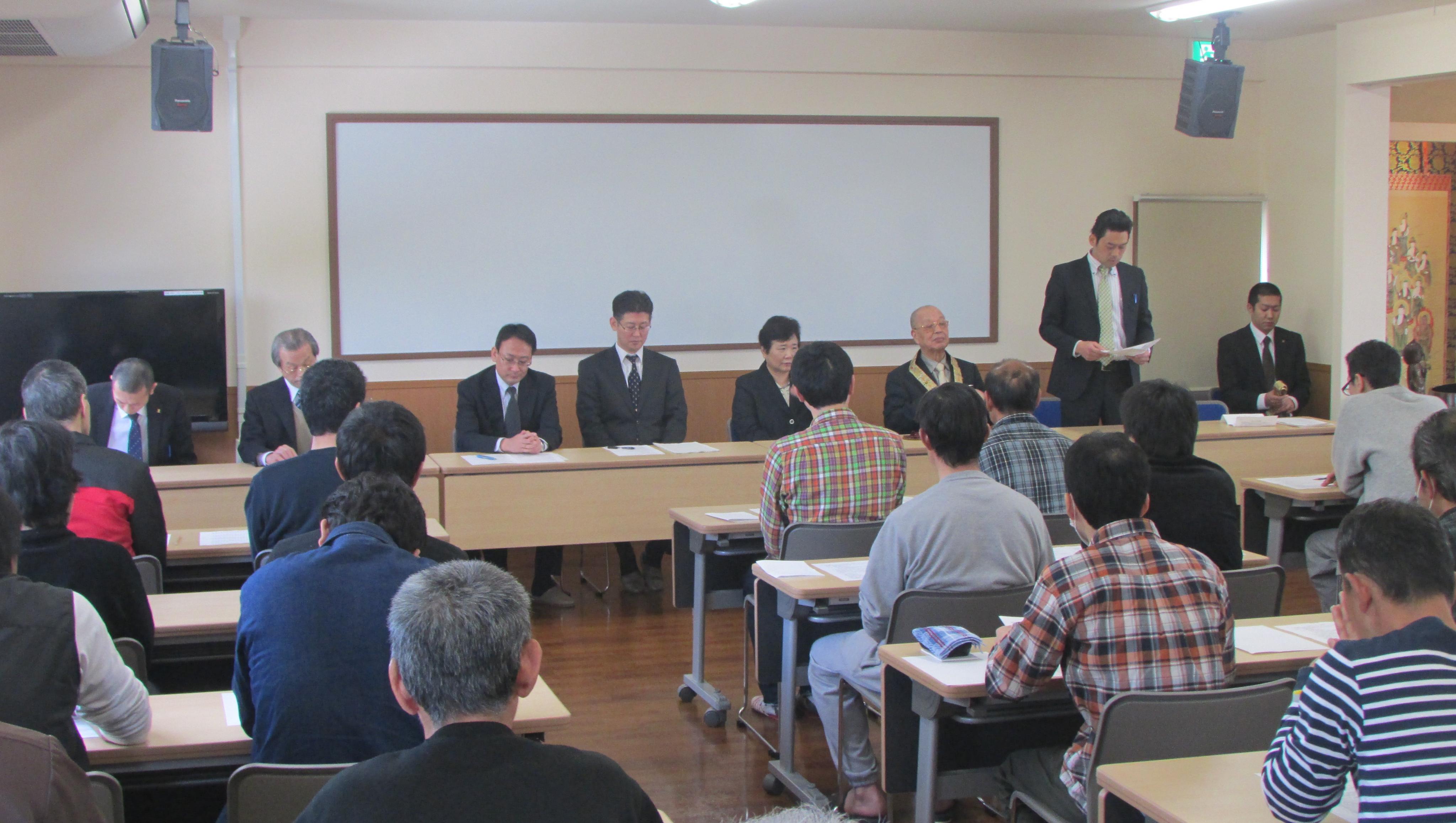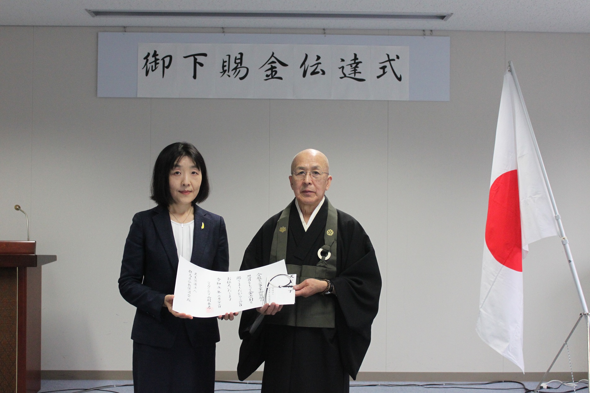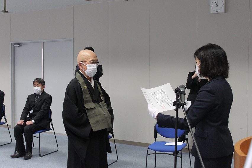 式には、群馬県保護司会連合会の武藤成孝前会長、群馬県更生保護女性連盟の岡すみ子前会長、群馬県就労支援事業者機構の吉川弘前所長、群馬県更生保護協会の中村昭典前事務局長ら各氏のご光臨を賜り、前橋保護観察所の田島佳代子前所長から松本泰恵前理事長に御沙汰書と御下賜金が手渡されました。田島前所長は「仏教保護会の献身的な努力が認められた結果であり、これからも被保護者の再犯防止と更生に当たってもらいたい」とあいさつされました。