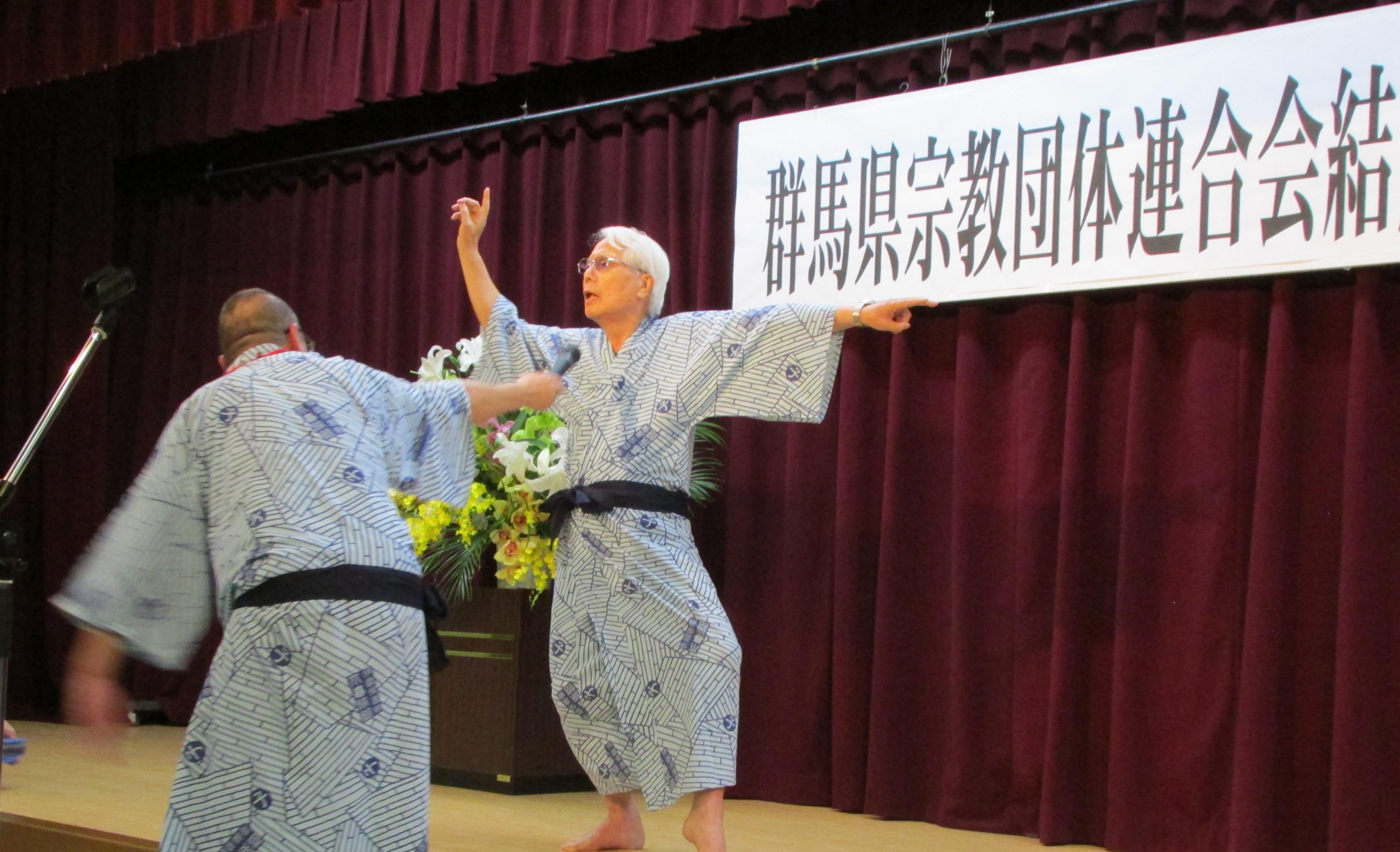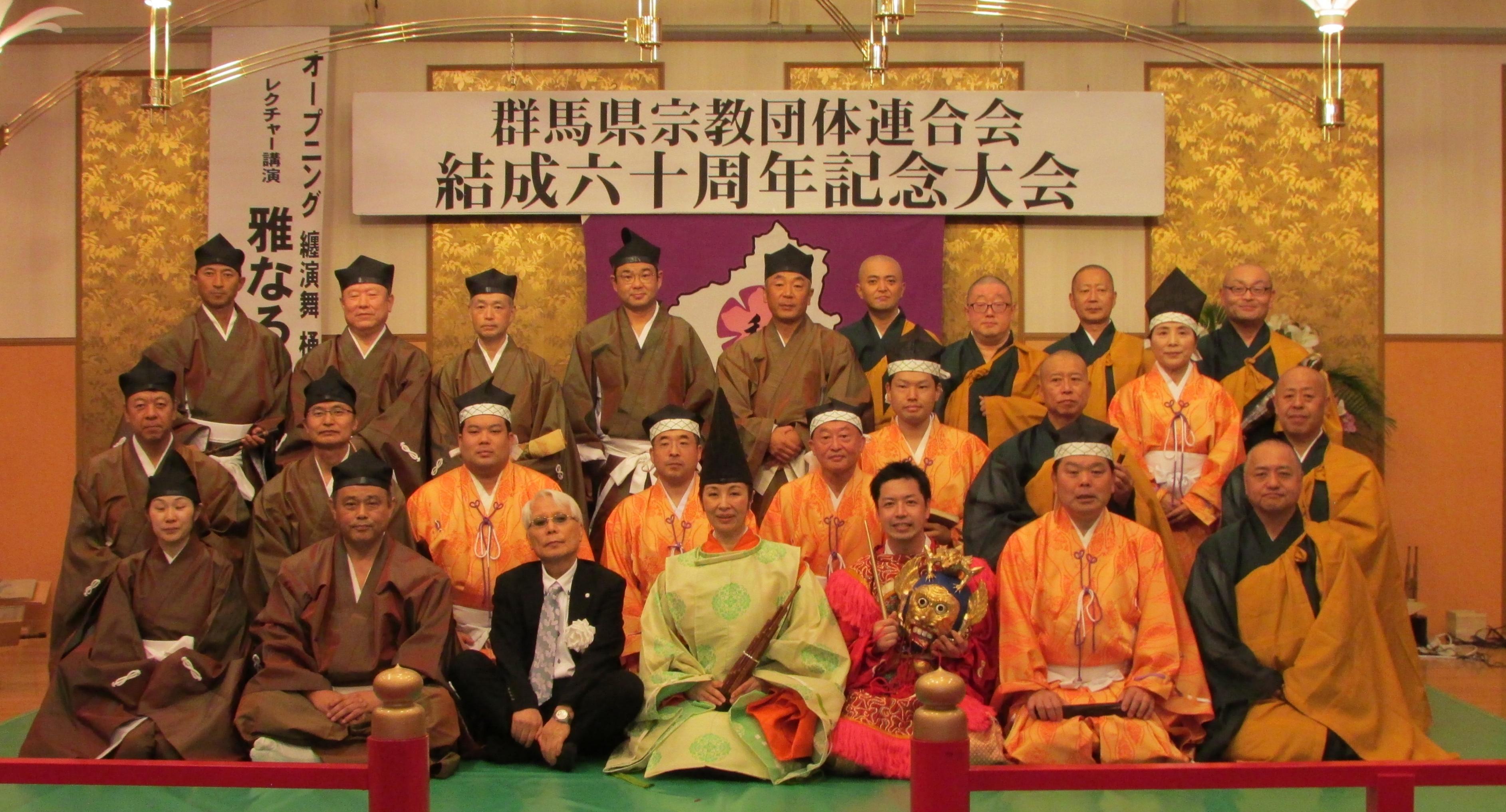 |  令和6年9月9日、伊香保ホテル木暮に於いて群馬県宗教団体連合会結成60周年記念大会が開催されました。同会は仏連、神社庁、天理教、新宗連の県内各宗教団体が個々の宗派・教義という垣根を超えて昭和39年に発足し、社会福祉の向上と世界平和の実現のため着実な歩みを重ねております。  記念大会は「つなぐ」をテーマに記念式典、アトラクション、祝賀会の三部構成で行われ、多くの方が参加され大盛会となりました。アトラクションでは立正佼成会による纏演舞、桶胴太鼓から始まり、仏連・神社庁・天理教と演奏家「東野珠実」氏友情出演による雅楽のコラボ演奏、レクチャー講演があり大変盛り上がりました。その後の祝賀会では教団同士の親睦をさらに深めることができました。  結成60周年という大きな節目を機に、生命の尊さや世界平和という結成理念を再確認、更なる協同邁進を誓い合い、有意義な大会の幕を閉じました。  群馬県宗教団体連合会結成60周年記念大会 (群馬テレビ)  |
