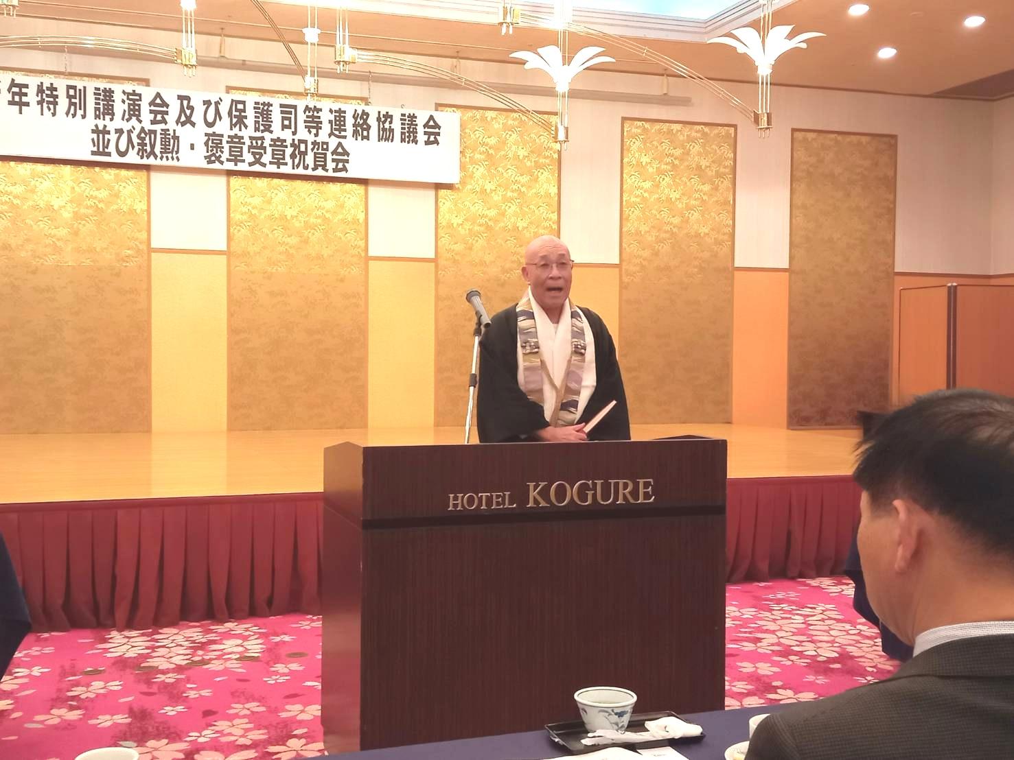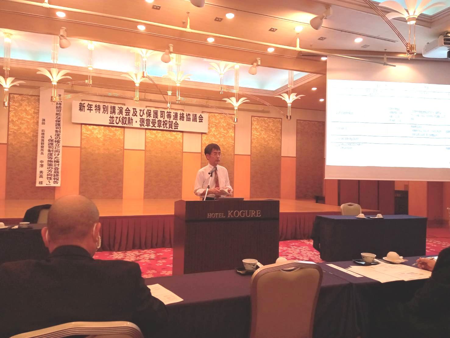 皆様こんにちは。  群馬県保護司会連合会の新年特別講演会及び新年祝賀会・叙勲等受章者祝賀会が伊香保ホテル木暮にて開催されました。 当会からは理事長、常務理事、施設長が参加しました。  特別講師として、前橋保護観察所の中澤秀高所長が保護司制度について講演されました。その後は褒章叙勲を受賞された保護司の方々の祝賀会が開かれ大いに盛り上がりました。さらに、保護司会連合会様より御寄附もいただきました。今後の全面改築のために活用させていただきます。ありがとうございます。本年もどうぞよろしくお願いします。