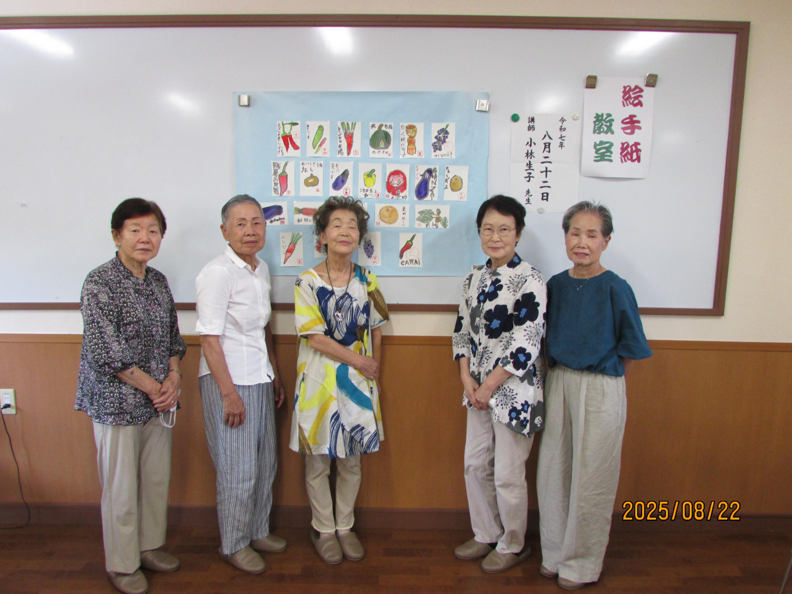 皆様こんにちは。 本日は絵手紙教室が久しぶりに開催されました。 本年度2回目の開催です。お忙しい中、講師である小林生子先生、オモダカの会様に来ていただき、とても和気あいあいと開催することが出来ました。 みんなで思い思いの絵手紙を描きましたが、とても味のある一枚が描くことが出来ました。中には何枚も描く寮生もおり、とても楽しめました。 ありがとうございました。