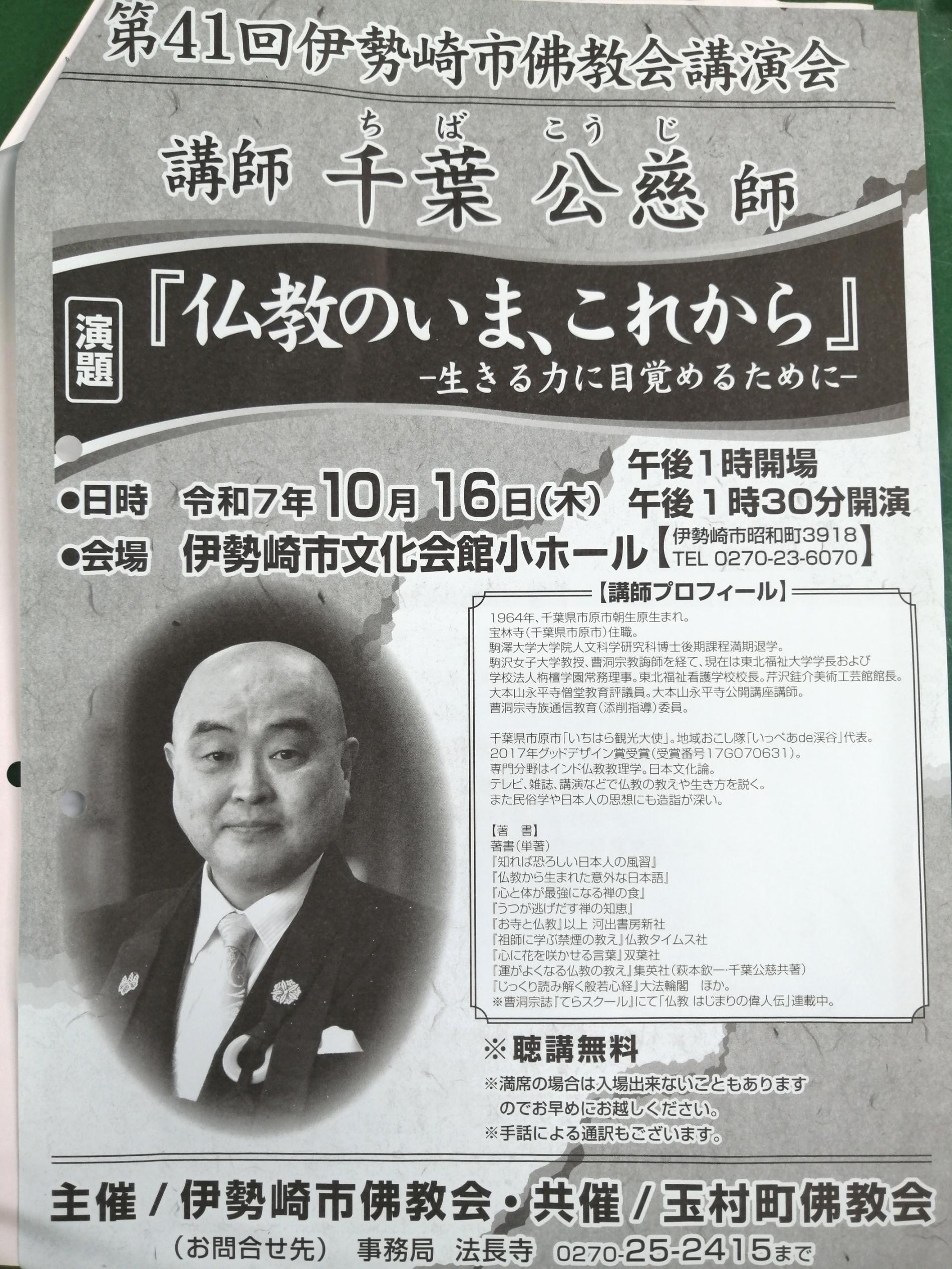 皆様こんにちは。 第41回伊勢崎市佛教会講演会が開催されました。毎年講演会の案内をいただき、会長が出席をしております。 今回は千葉県市原市の曹洞宗宝林寺住職の千葉公慈師が「仏教のいま、これから-生きる力に目覚めるために-」という演題で講演をして頂きました。テレビ、雑誌、講演など様々な場で仏教の教えや生き方を説いておられ、今回もありがたいお話ばかりでした。お忙しい中ありがとうございました。 ![]()  |