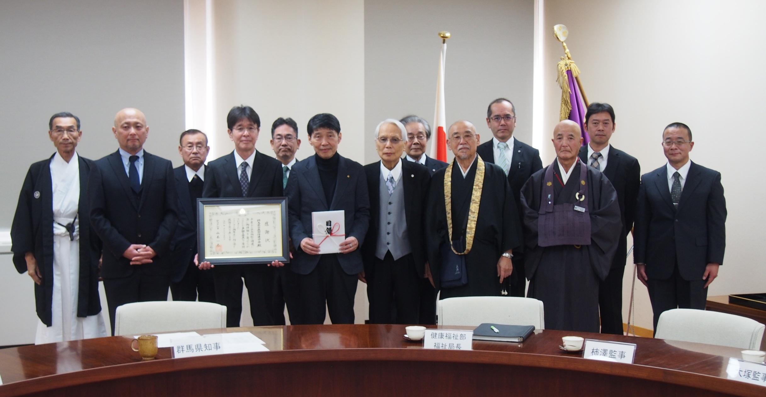 皆様こんにちは。 群馬県仏教連合会は仏教連合会、神社庁、天理教、新宗連からなる群馬県宗教団体連合会に所属しており、各教団で集められた歳末助け合い募金を毎年群馬県に寄託しております。 仏教連合会も各地区の仏教会から集められた多額の浄財を寄託させて頂きました。 12月16日に群馬県庁で行われた寄託式には山本一太知事にも出席して頂きました。この浄財は毎年群馬県の社会福祉施策などに効果的に活用して頂いております。 皆様のありがたいお気持ちに改めて感謝を申し上げます。 ありがとうございました。