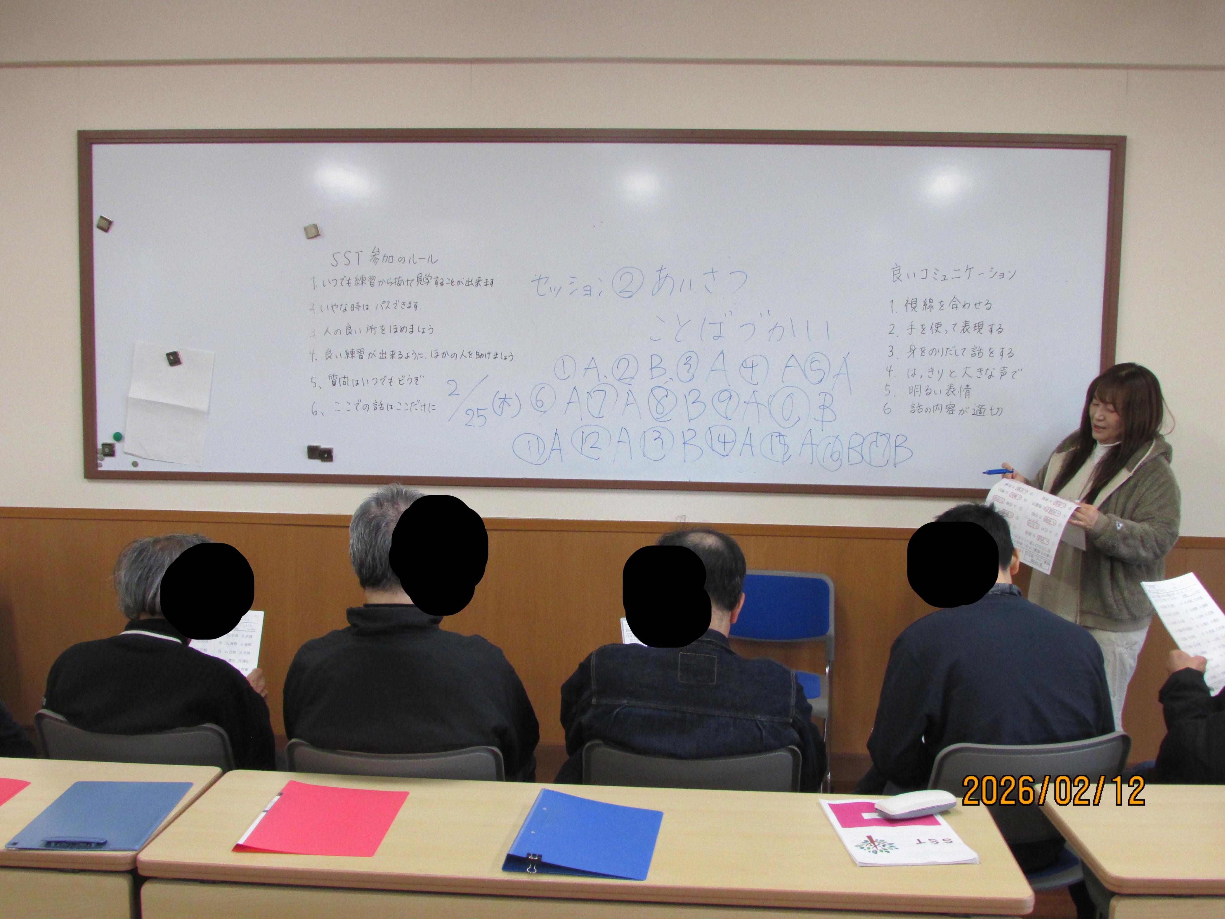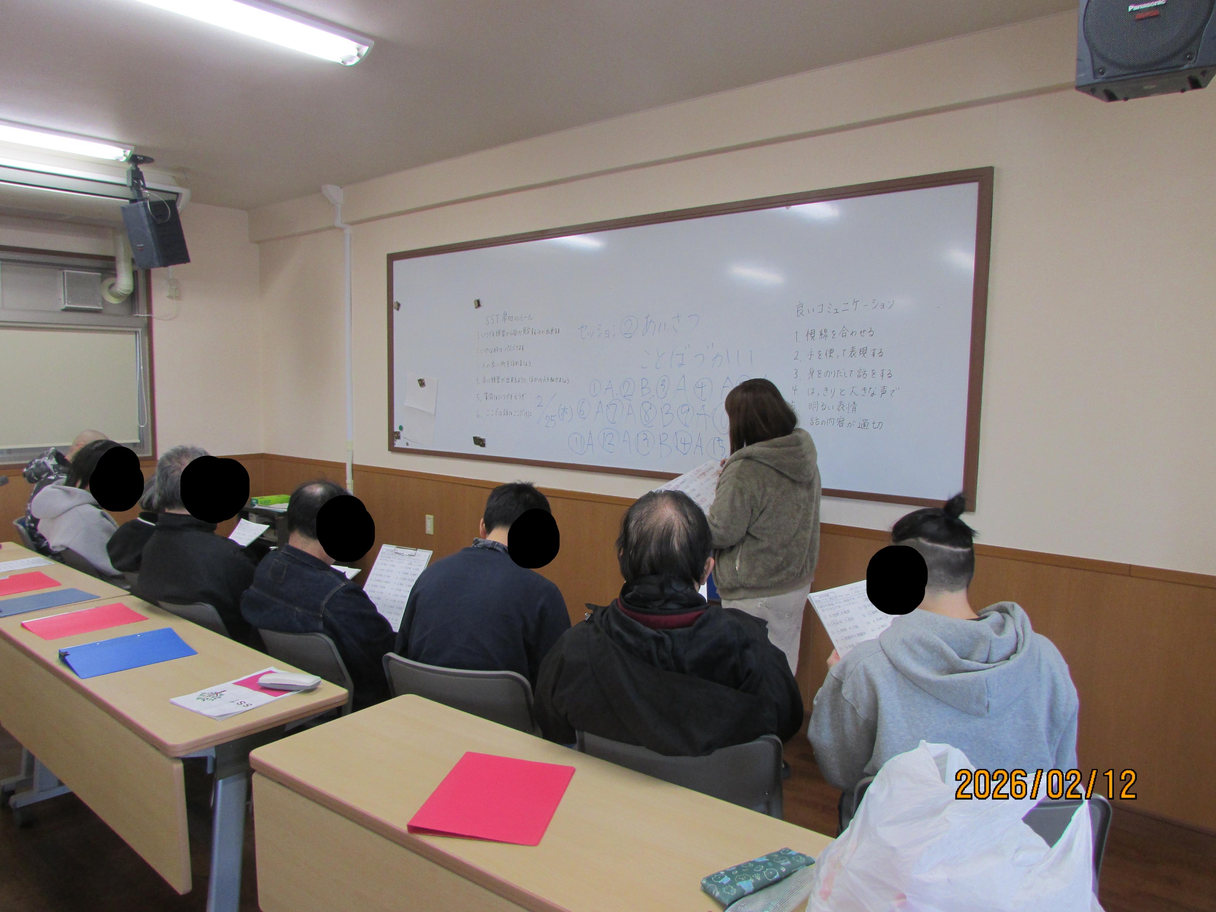皆様こんにちは。 SST(ソーシャルスキルトレーニング)集会を開催しました。 基本的な挨拶の仕方や言葉遣いなど、社会生活に必要な知識や教養を確認したり身に付けさせるもので、月に一度程度開催しております。仕事で出席できなかった人以外の寮生と、退会した元寮生も参加してくれました。初めての参加の人もいるため、今回もテキストを用いてSSTの説明や他者とのコミュニケーション方法などについて実際にロールプレイングを通して学ぶことが出来ました。