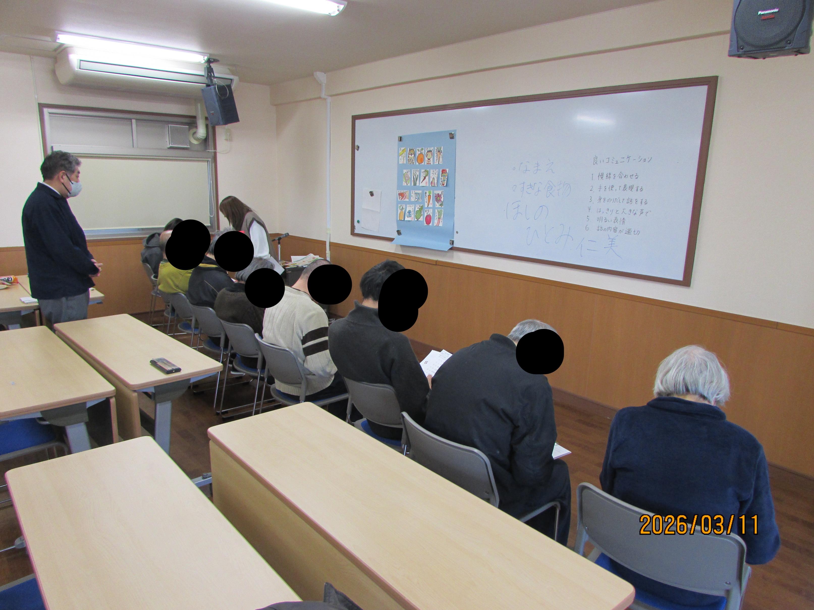 基本的な挨拶の仕方や言葉遣いなど、社会生活に必要な知識や教養を確認したり身に付けさせるもので、月に一度程度開催しております。仕事で出席できなかった人以外の寮生が参加しました。初めての参加の人もいるため、今回もテキストを用いてSSTの説明や、実際にロールプレイングを通して学ぶことが出来ました。